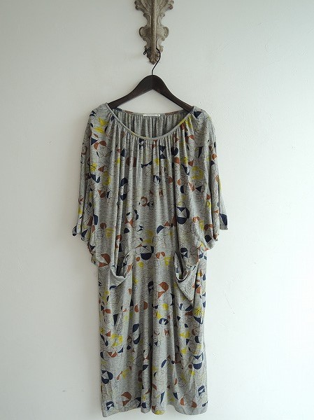 デザイン:mina perhonen 「Cosmo」のカットソーワンピースです。カラーはミックスグレーベースに、イエロー・茶・濃紺の総柄プリントで伸縮性のある生地であしらわれております。襟ぐりにギャザーを入れたゆったり身幅で、両サイドにたるんと下がったポケットがあります。定価29,400円です。(掲載写真は、実商品のカラーにできるだけ近づけるよう努力はしておりますが、お使いのモニターや画面設定等によっては、色が異なって見える場合もございますので、予めご了承下さい)