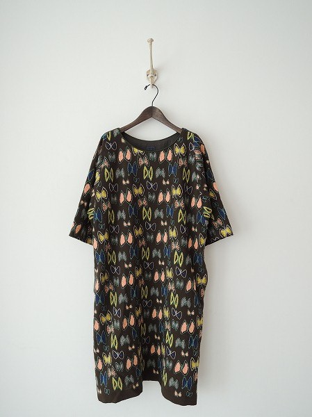 デザイン:mina perhonen 「sky flower」のワンピースです。カラーはチャコールブラウンベースで、グレー・ネイビー・薄めグリーン・イエロー・サーモンピンクなどのカラフルな刺繍が施されております。袖丈は七分くらい、両腰にシームポケット付きです。(掲載写真は、実商品のカラーにできるだけ近づけるよう努力はしておりますが、お使いのモニターや画面設定等によっては、色が異なって見える場合もございますので、予めご了承下さい)