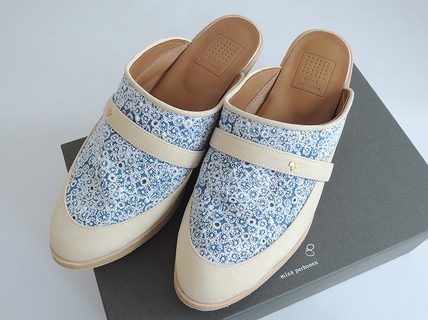 デザイン:mina perhonenのpied des boisシリーズのサボサンダルです。カラーはライトベージュのレザーと、くすんだブルー地にホワイトで刺繍とカットワークが施された生地の切り替えデザインで、甲部分にゴールドの小さな蝶々のモチーフがあしらわれたデザインです。