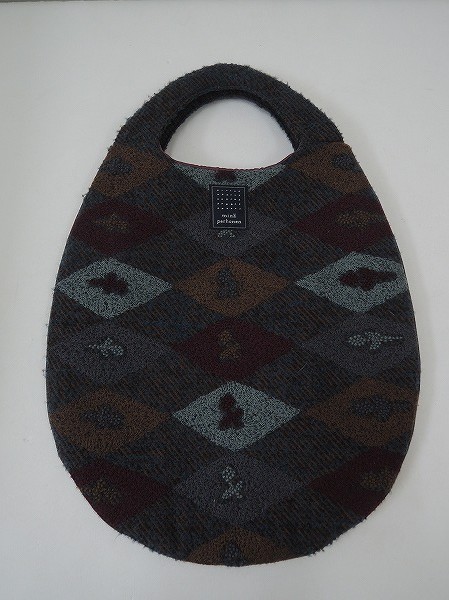 デザイン:mina perhonen 「charades」のエッグバッグです。ライトブルー・濃ブラウンミックス×ブラウンのバイヤス織の毛羽のある生地ベースに、あずき色・サックス・グレー・ブラウンの刺繍があしらわれており、濃ブラウンの合皮のパイピングが施されております。裏地はあずき色で、素材は表地-綿32%、毛30%、ポリエステル14%、アクリル13%、ナイロン11% 刺繍部-アクリル60%、毛40% 裏地-ポリエステル100%です。
