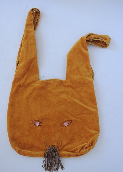 デザイン:mina perhonen 「usa bag」のうさバッグ大です。カラーはマスタードイエローで、別珍生地であしらわれており、ライトブラウンの刺繍、ピンクの貝ボタン、ベージュの革紐などでうさぎさんの顔になっています。内ポケットが1つあり、開口部は結んで使用するデザインになっており、素材は表地&刺繍共にコットン100%です。