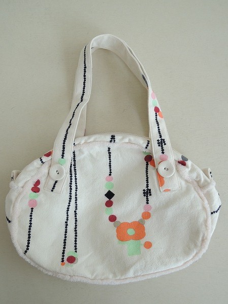 デザイン:mina perhonen 「chandelier」のクラウドバッグ小です。カラーはアイボリーで、黒・オレンジ・えんじ・パステルグリーン・ゴールド箔・濃グレーのプリントが全面にあしらわれており、ベビーピンクのボアのパイピングが施されております。開口部はジップ仕様で、裏地はパステルグリーンの別地に切替えられております。素材は表地&裏地共に綿100%です。