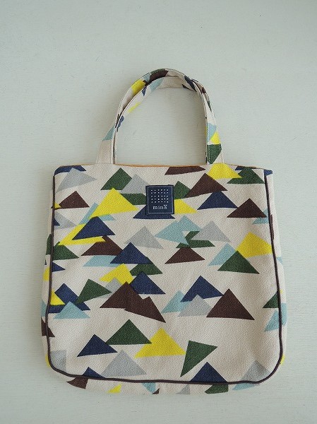 デザイン:minaのAlpsシリーズのミニトートバッグです。カラーはベージュ地にイエロー・ブラウン・ライトグレー等の総柄で、パイピングはブラウン生地が使用されています。内側は光沢のあるオレンジの裏地が付いており、素材は表地が毛100%、裏地がポリエステル100%です。