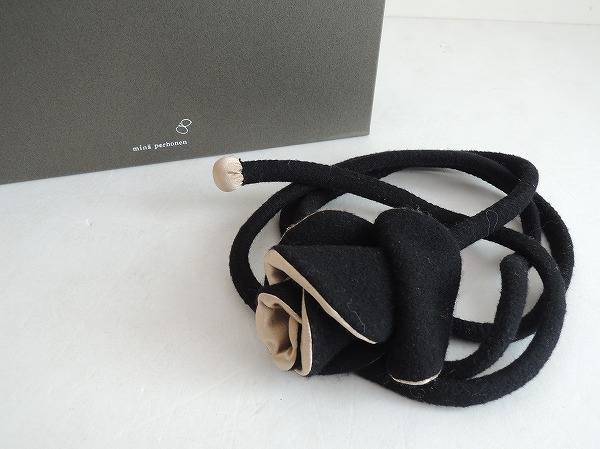 デザイン:mina perhonen 「naught」のお花ベルトです。カラーはブラックでフェルト地であしらわれており、裏地はベージュの光沢のあるさらりとした薄手生地に切替えられております。サイドはお花のモチーフが施されており、結んで使用するデザインです。定価18900円の商品で、保存箱付きです。