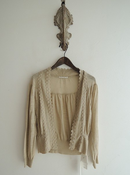 デザイン:mina perhonen 「sorbet」のニットカーディガンです。カラーはグレーベージュで、透け感のあるシルク混の薄手ニットであしらわれており、共布の刺繍レースが施されております。ショート丈のデザインで、フロントの留め具は付いておりません。定価56700円の商品です。(掲載写真は、実商品のカラーにできるだけ近づけるよう努力はしておりますが、お使いのモニターや画面設定等によっては、色が異なって見える場合もございますので、予めご了承下さい)