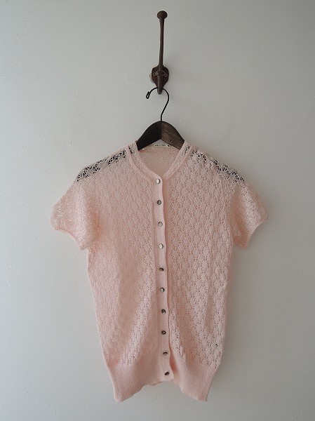 デザイン::mina perhonen「meringue」のニットカーディガンです。カラーはピンクで、透かし編みの施されたニット素材であしらわれております。フロントボタン開閉になります。 (掲載写真は、実商品のカラーにできるだけ近づけるよう努力はしておりますが、お使いのモニターや画面設定等によっては、色が異なって見える場合もございますので、予めご了承下さい)