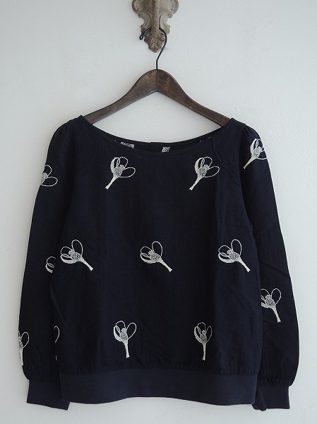 デザイン:mina 「mademoiselle」の背開きシャツです。カラーはネイビーで薄手生地であしらわれており、オフホワイトの刺繍が全面に施されております。袖口&裾はリブに切替えられており、背ボタン開閉のデザインです。(掲載写真は、実商品のカラーにできるだけ近づけるよう努力はしておりますが、お使いのモニターや画面設定等によっては、色が異なって見える場合もございますので、予めご了承下さい)