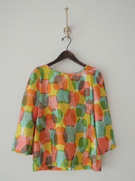 デザイン:mina perhonen 「pomme」のシルクブラウスです。カラーはピンク×イエロー×グリーンなどのミックスで、薄手素材であしらわれております。背ボタン開閉で、定価36、750円の商品です。 (掲載写真は、実商品のカラーにできるだけ近づけるよう努力はしておりますが、お使いのモニターや画面設定等によっては、色が異なって見える場合もございますので、予めご了承下さい)