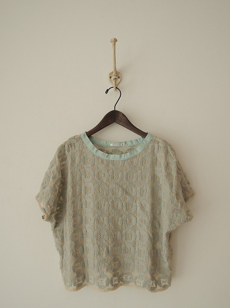 デザイン:mina perhonen 「dear」のシフォンブラウスです。ライトベージュの楊柳シフォン生地にくすんだ感じのミントカラーの刺繍が施されております。プルオーバータイプのブラウスです。(掲載写真は、実商品のカラーにできるだけ近づけるよう努力はしておりますが、お使いのモニターや画面設定等によっては、色が異なって見える場合もございますので、予めご了承下さい)