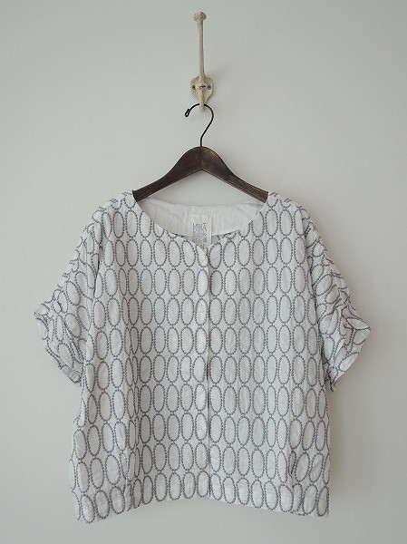 デザイン:ミナペルホネンランドリー「porcelain」の刺繍ブラウスです。カラーはホワイト×グレーの刺繍入りで、やや薄手生地であしらわれております。ボタン開閉になります。 (掲載写真は、実商品のカラーにできるだけ近づけるよう努力はしておりますが、お使いのモニターや画面設定等によっては、色が異なって見える場合もございますので、予めご了承下さい)