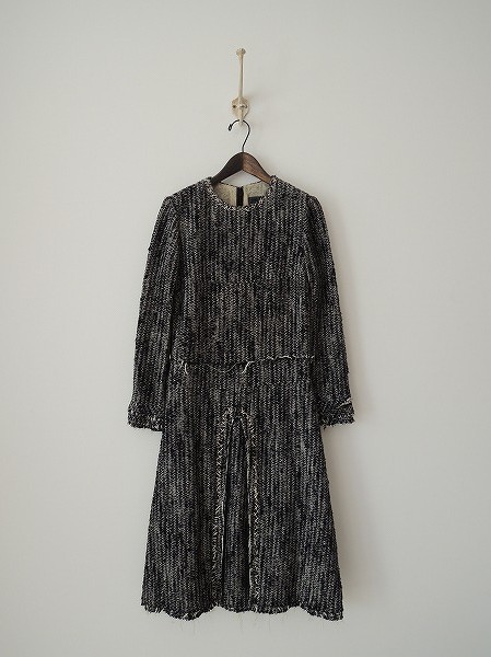 デザイン:mina perhonen「mica」のツイードワンピースです。カラーは黒×オフホワイトの毛羽感のあるツイード素材であしらわれております。バックフック&ファスナーで着脱でき、前スカートにボックスプリーツデザインが施され、裁ち切り仕様です。ソフトチュールの裏地付きです。