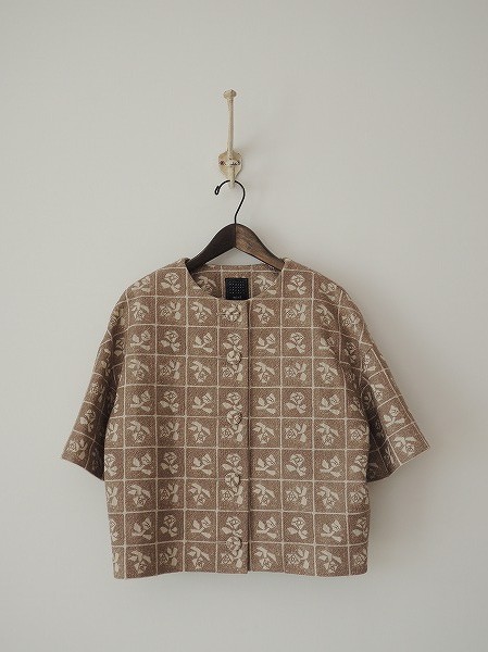 デザイン:mina perhonen 「Lili」のジャケットです。カラーはベージュベースにモカブラウンの刺繍が施されております。フロントボタン開閉で、シルクの裏地付きです。