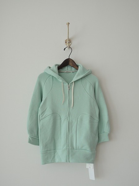 デザイン: mina perhonen「melone」 のジップアップパーカです。カラーはミントで、フロントジッパー開閉になります。両サイドにポケットがあり、フード口にはひもが通してあります。定価は18,900円です。
