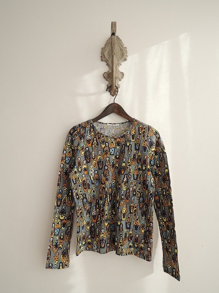 デザイン:mina perhonen「matryoshka」の総柄カットソーです。カラーはグレーグリーン(プライスタグ・グリーン)ベースに様々なマトリョーシカがプリントされたカットソー地であしらわれております。定価は15、750円です。