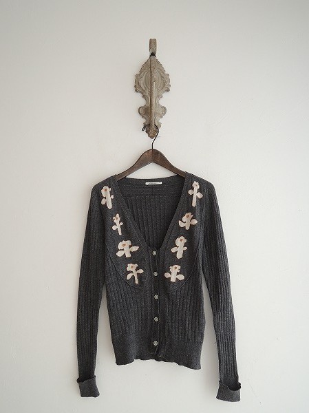 デザイン:mina perhonen 「day break」のカーディガンです。カラーはチャコールで、リブ織りの薄手コットンニット素材であしらわれております。フロントはお花のモチーフになっており、フロントボタンで開閉できます。定価39,900円です。