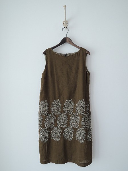 デザイン:mina perhonen 「sometimes lucky」の刺繍ワンピースです。カラーはカーキで薄手生地であしらわれており、グレーグリーンのクローバー刺繍の中にひとつだけ四葉があるテキスタイルです。背上部のフック&ファスナーで着脱でき、裏地付きです。定価は67、200円です。