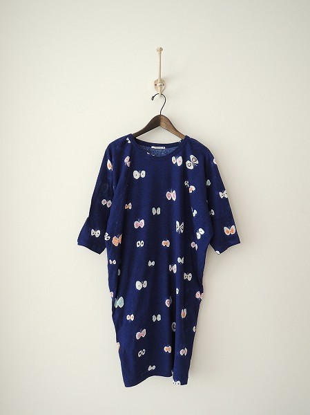 デザイン:mina perhonen「hana hane」のワンピースです。カラーはムラ染めの青ベースに色とりどりの蝶々が施されたカットソー地であしらわれております。定価は23、100円です。