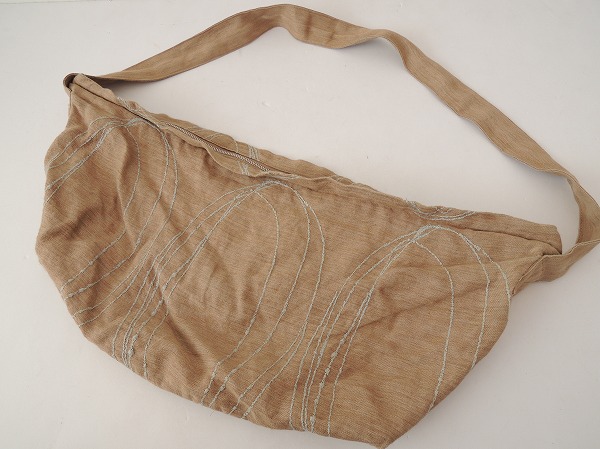 デザイン:mina perhonenのlight holeシリーズのボディバッグ小です。カラーは薄いブラウンのミックスカラー地に淡い水色がかったグレーで刺繍が施されたデザインで、開口部はファスナーです。内側には濃いグレーの裏地とポケットが1つ付いており、素材は表生地が麻100%、刺繍部分が綿100%、裏生地が綿100%です。