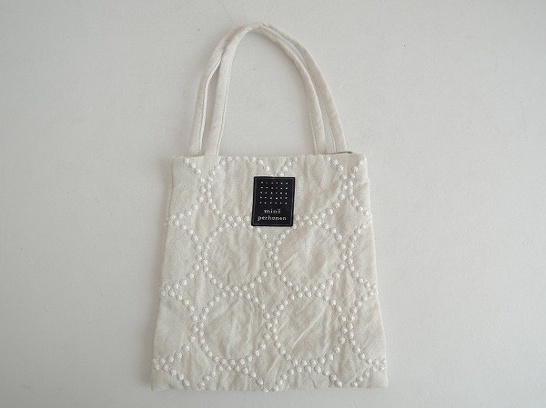 デザイン:mina perhonenのtambourineシリーズのミニバッグです。カラーはライトベージュベースに、オフホワイトの刺繍が全面に施されたデザインです。内側にはオフホワイトの裏地が付いており、素材は表生地が綿46%、麻36%、ナイロン18% 刺繍部分は綿100% 裏生地がポリエステル100%です。