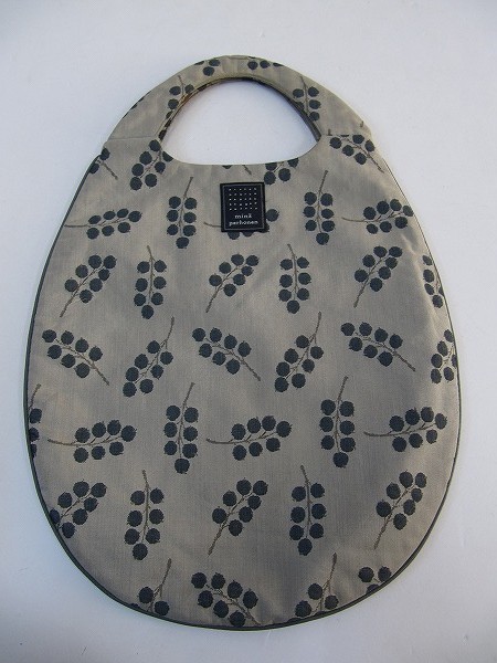 デザイン:mina perhonenのnantenシリーズのエッグバッグです。カラーはグレーベースに、ネイビー&ダークグレーでなんてんの実の模様織りが全面に施されたデザインです。パイピングにはネイビーグレーの合皮が施され、内側には光沢のあるうぐいす色の裏地が付いております。素材は表地が綿57%、プロミックス43% 裏地がポリエステル100% 合皮部分は表皮がポリウレタン100%で裏がキュプラ80%、ナイロン20%です