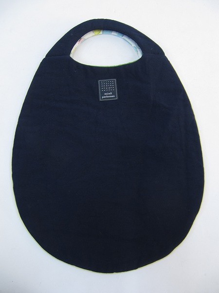 デザイン:mina perhonenのエッグバッグです。カラーはフロントが「kakurenbo」のネイビーで、大きなドット柄の下には、チョウチョの刺繍があり、自分の好きなところを切り取ってチョウチョを見せる事ができます。バックが「jelly beans」のオフホワイト地に淡いピンク・水色・イエロー等の手書き風の水玉模様が一面に描かれたデザインです。パイピングにはライトベージュの合皮が施され、内側には光沢のあるライトグリーン系の裏地が付いております。