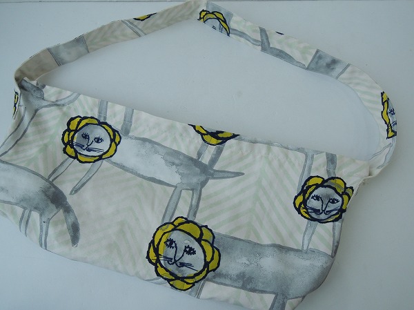 デザイン:mina perhonenのlookシリーズのボディバッグ小です。カラーはオフホワイト×薄い淡グリーンに、グレー×イエロー×ネイビーなどでライオンのプリントが施されています。開口部はファスナーで、内側にはグレーの内布と、ポケットが1つあります。素材は表生地が綿65%、麻35%で、裏生地は綿100%です。