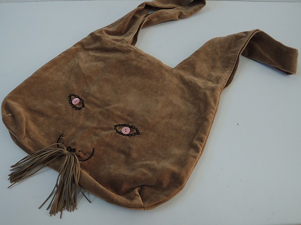 デザイン:2012-13AWのmina perhonenのusa bagシリーズのうさバッグ大です。カラーはライトブラウンで、フロントにはブラックの刺繍とピンクのボタン、黄土色のレザー紐でうさぎさんのお顔がデザインされたお品で、持ち手は耳の様にあしらわれています。内側にポケットが1つ付いており、素材は綿100%です。