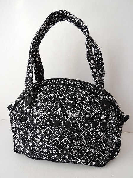 デザイン:mina perhonenのpartyシリーズのクラウドバッグです。カラーはブラック地にホワイトで蝶々の刺繍とカットワークが一面に施されたデザインで、パイピングはブラックの毛足の長いパイルです。開口部はファスナーで、内側にはネイビーの裏地とポケットが2つ付いています。素材は表生地が麻100%、刺繍部分・裏生地が共に綿100%です。