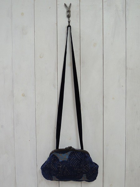 デザイン:mina perhonenのwoolly ballシリーズのカドルバッグです。カラーはベージュ×水色のお花刺繍ベース生地に、ネイビーのパイル刺繍が施されたデザインで、開口部は小鳥のモチーフが飾られたがま口です。持ち手は少し光沢のあるネイビーのベロアリボンで、内側には深緑の裏地とポケットが1つ付いています。
