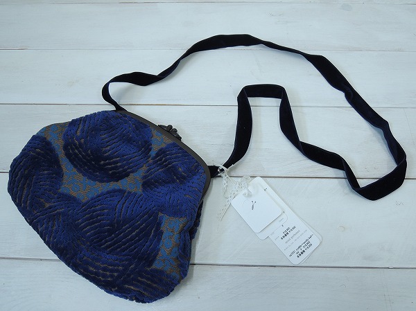 デザイン:ミナペルホネン「cuddle~woolly ball~」のカドルバッグです。ライトブルー×ゴールドのお花の刺繍地ベースに、ネイビーのパイルが施されております。開口部はガマ口で、ネイビーのベロアひもが付いており、内ポケット×1つ付きです。素材はコットン54%、レーヨン46%、 パイル-コットン100%です。