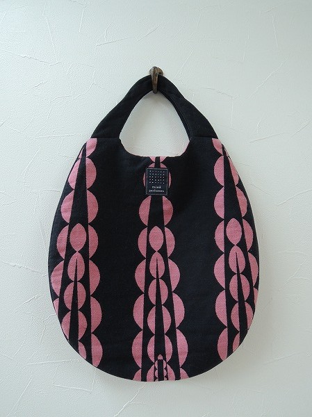 デザイン:mina perhonen 「cloudy flower」のエッグバッグです。カラーはブラックで少し毛羽のあある生地に濃ピンクの刺繍が施されており、ブラックの合皮のパイピングが施されております。裏地は濃ピンクで、素材は表地-コットン77%、シルク14%、カシミヤ9% 裏地-ポリエステル100% パイピング部-合成皮革です。