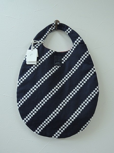 デザイン:mina perhonen 「tile」のエッグバッグです。ネイビーベースにホワイトの刺繍入りの生地であしらわれており、ホワイトの合皮のパイピングが施されております。裏地はピンクで、素材は表地-リネン100% レース-コットン100% 裏地-ポリエステル100% パイピング部-人工皮革です。