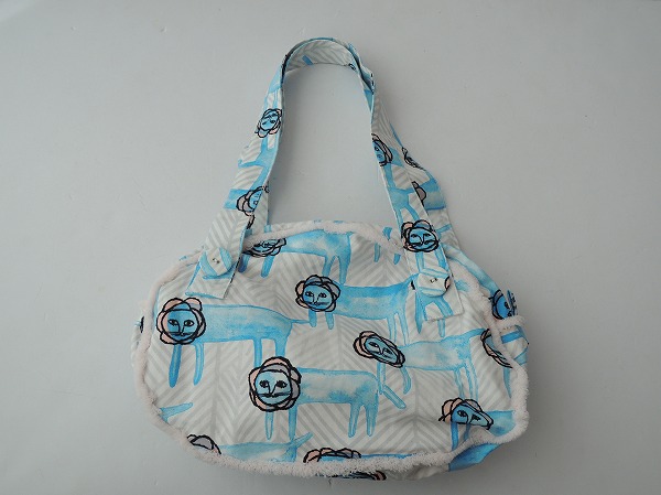 デザイン:mina perhonen 「look」のクラウドバッグです。白ベースに薄グレー&薄ブルー系・薄ピンク・ネイビーのプリント入りの生地であしらわれており、サイドは少しピンクがかったホワイトのボアのようなフリンジのパイピングが施されております。開口部はファスナー仕様で、裏地は薄ピンクになっており、内ポケット×2付きです。素材は表地-綿65%、麻35% 裏地-綿100%です。