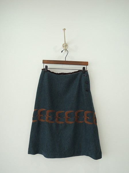 デザイン:2012-13AWコレクション mina perhonen「go!」の刺繍入りスカートです。カラーはくすんだグリーン(プライスタグ・ブルー)で、柔らかな毛羽のある素材であしらわれております。左腰ボタンで着脱でき、刺繍入りです。裏地付きで、定価は39、900円です。