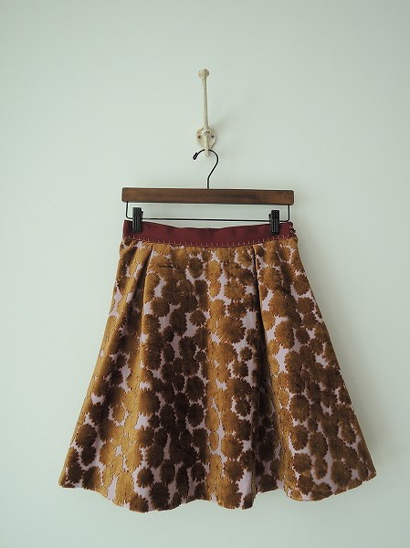 デザイン:2012-13AW年コレクションmina perhonen「good news!」フレアスカートです。カラーはラベンダー地にブラウンのパイル模様が施され、左腰フック&ファスナーで着脱できます。裏地付きです。定価は54、600円です。