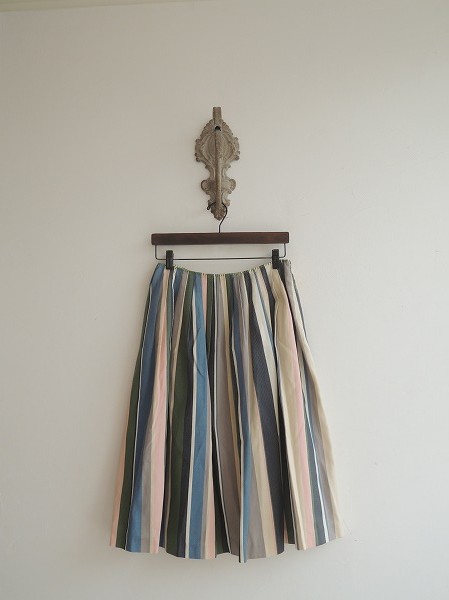 デザイン:mina perhonen 「multistripe」のスカートです。カラーはブルー×グリーン×紺×薄ピンク×ベージュなどのストライプで、ほんの少し毛羽のある素材です。斜めに畝のある生地で、ウエスト部分はタック&かがり縫いが施されております。左サイドに着脱フック&ファスナーがあり、ピンク色の裏地付きで、ポケットは付いておりません。