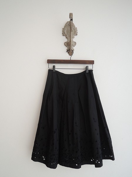 デザイン:mina perhonen 「sunny spots」のシルクスカートです。カラーはブラックでカットワーク刺繍入りの生地であしらわれております。プリーツ風にランダムにタックが施されフレアなシルエットになっており、左腰の小さなベルト&ファスナーで着脱できます。
