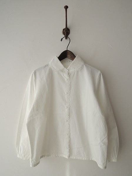 デザイン:mina perhonen 「fog night」のブラウスです。カラーは白で、フロントボタン開閉です。襟周り&前立て&裾周りにレースがあしらわれております。定価26,250円です。