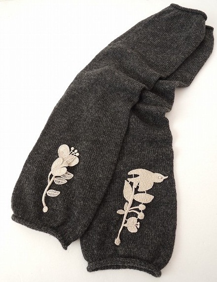 デザイン:mina perhonenのforest paradeシリーズのアームウォーマーです。カラーは濃いグレーのミックスカラーで、上部サイドにライトベージュの刺繍モチーフがあしらわれたデザインです。