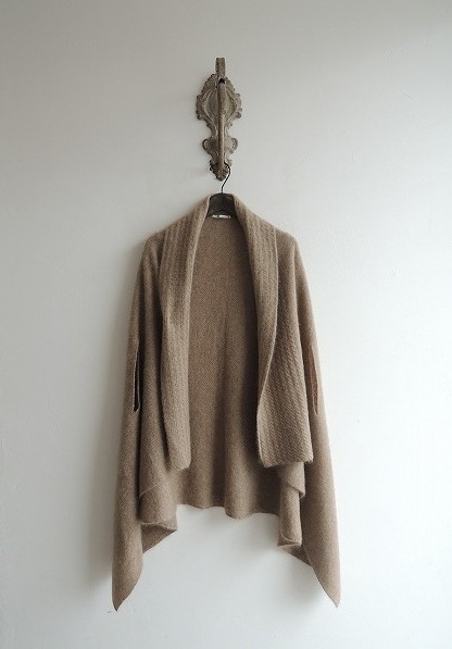 デザイン:mina perhonenの羽織りストールです。カラーはモカベージュで、毛羽のある柔らかなニット素材であしらわれております。腕を通して頂けるホールが施され、ゆったりと羽織って頂けるデザインです。