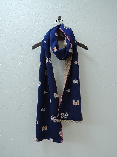 デザイン:mina perhonen「hana hane」のストールです。カラーはムラのあるネイビー地に、ベージュ・ピンク・オレンジ等で蝶々が描かれています。裏面はブラウンベージュのやや起毛がかった生地です。素材はウール63%、コットン37%です。