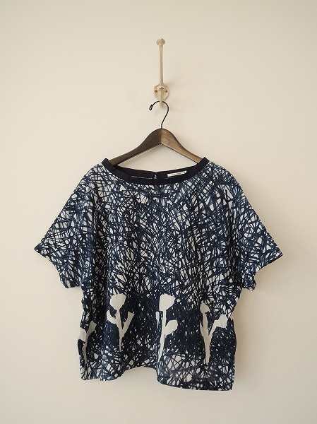 デザイン:mina perhonen 「wind dance」の半袖幅広ブラウスです。カラーはネイビーとホワイトの総柄で、後ろループボタン付きドロップホールです。衿ぐりは別布があしらわれています。定価は29、400円です。