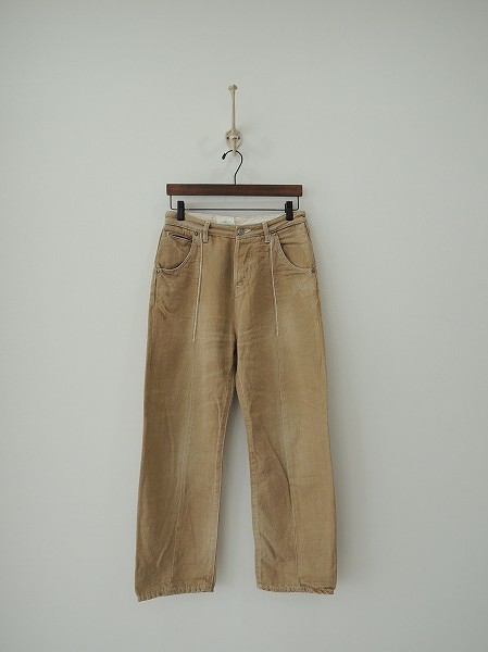 デザイン:mina perhonen 「always」のパンツです。カラーは濃いめのベージュでアイボリーのステッチ入りの生地であしらわれており、ユーズド&小さなダメージ加工が施されております。フロントボタンはトップ以外は比翼仕立てで、5ポケットです。
