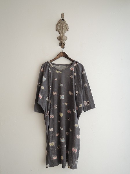 デザイン:mina perhonen 「hana hane」のドルマンスリーブワンピースです。ライトグレーベースの薄手生地にムラのあるチャコールグレー&カラフルな蝶のプリントが施されております。定価23100円の商品です。