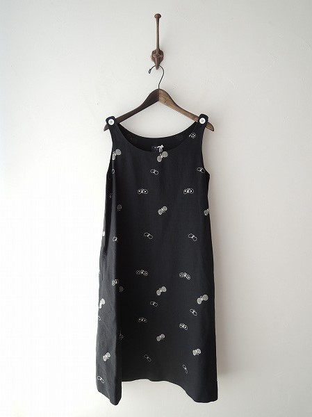 デザイン:mina perhonen 「choucho」のAラインワンピースです。カラーはブラックで、オフホワイトの刺繍入りのシルク混の生地であしらわれております。両肩のボタンで着脱でき、両腰にシームポケットが施されております。定価45150円の商品です。