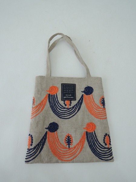 デザイン:mina perhonen 「twitter」のミニバッグです。サンドベージュの薄手生地ベースにネイビー&オレンジの刺繍が施されており、裏地はパープルです。素材は表地-麻100%、刺繍糸-綿100%、裏地-ポリエステル100%です。
