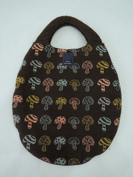 デザイン:mina perhonen 「polka」のエッグバッグです。カラーは濃ブラウンで、ピンク・マスタード・サックス・ライトグレーの刺繍があしらわれており、濃ブラウンの合皮のパイピングが施されております。裏地は濃ブラウンで、素材は表地-毛61%、絹39% 刺繍部-綿100% 裏地-ポリエステル100%です。
