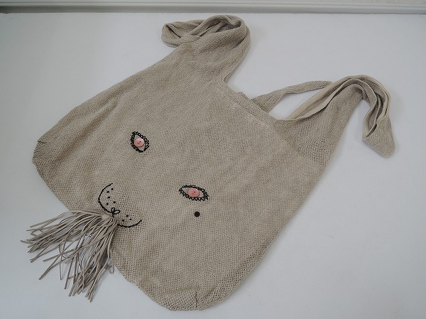デザイン:mina perhonen 「usa bag」のうさバッグ大です。サンドベージュベースにブラックの刺繍・ピンクの貝ボタン・グレーのフリンジ・ブラックのラインストーンでうさぎさんのお顔があしらわれております。開口部は結んで使用するデザインで、内袋はホワイトの布地になっており、内ポケットがひとつ付いております。素材は表地-麻100%、内袋-綿100%です。