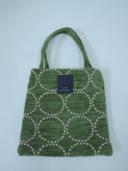 デザイン:mina perhonen 「tambourine」のミニバッグです。カラーは少し淡いグリーンで、別珍のよな生地にライトグレーの刺繍が施されております。裏地はグリーンで、素材は表地-アクリル46%、綿32%、毛14%、ポリエステル8% レース-綿100% 裏地-綿100%です。