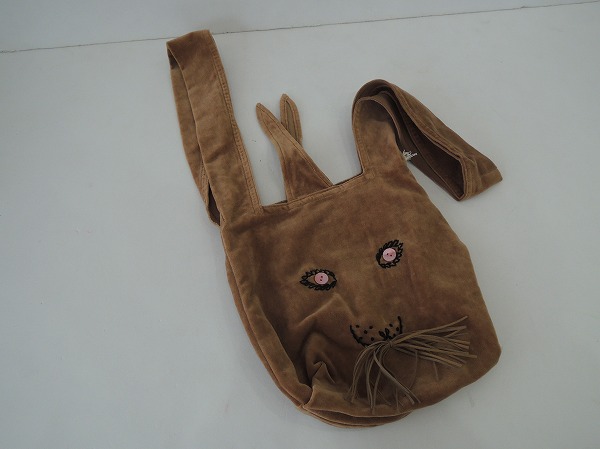 デザイン:mina perhonen 「usa bag」のうさバッグ小です。カラーは濃ベージュでベロア地であしらわれており、フロントにはピンクのシェルボタン&ブラックの刺繍&ベージュのフリンジでうさぎさんのお顔が施されております。開口部は結んで使用するデザインで、内ポケットがひとつ付いております。素材はコットン100%です。